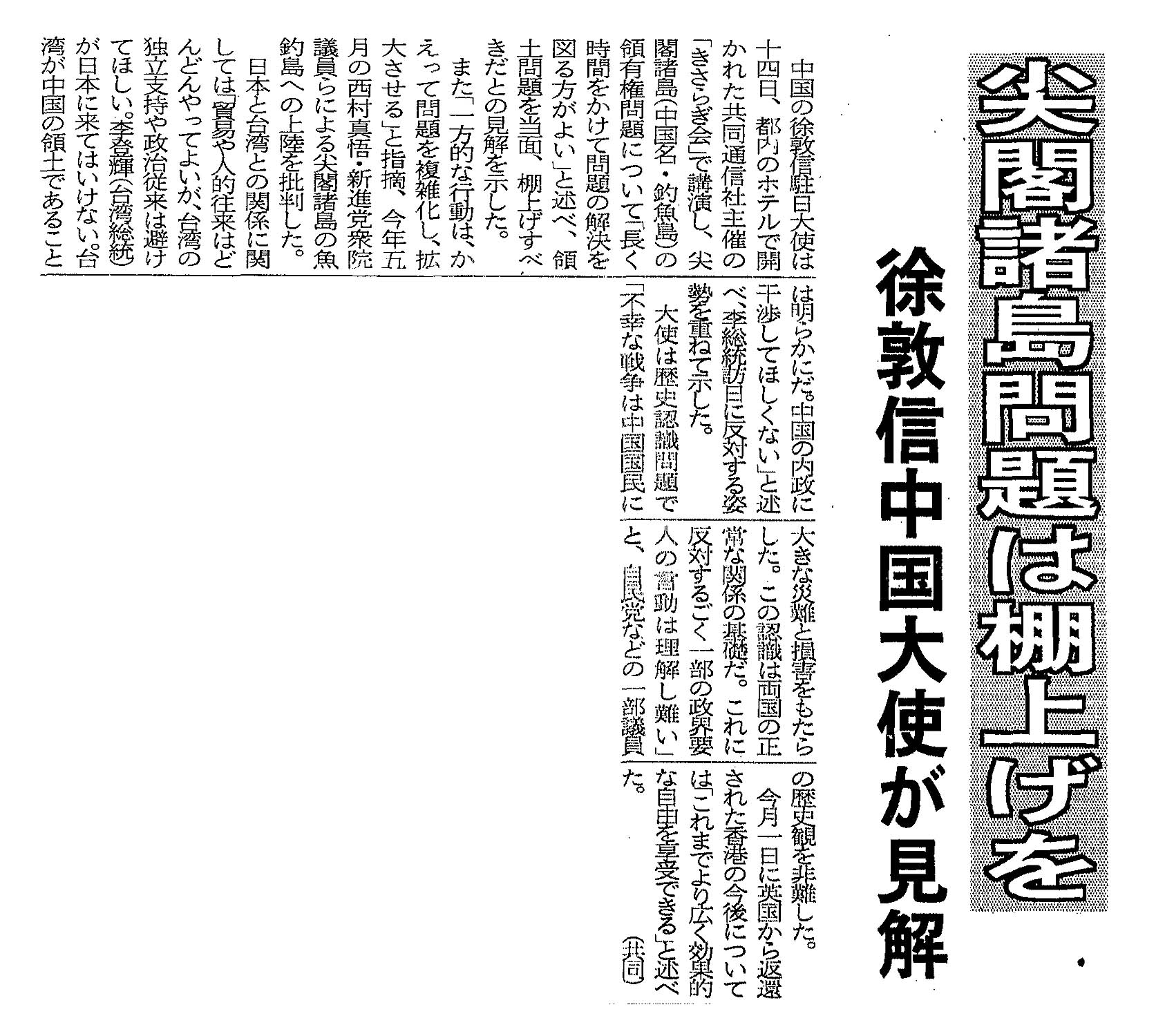 > 尖閣諸島問題は棚上げを/徐敦信中国大使が見解:
