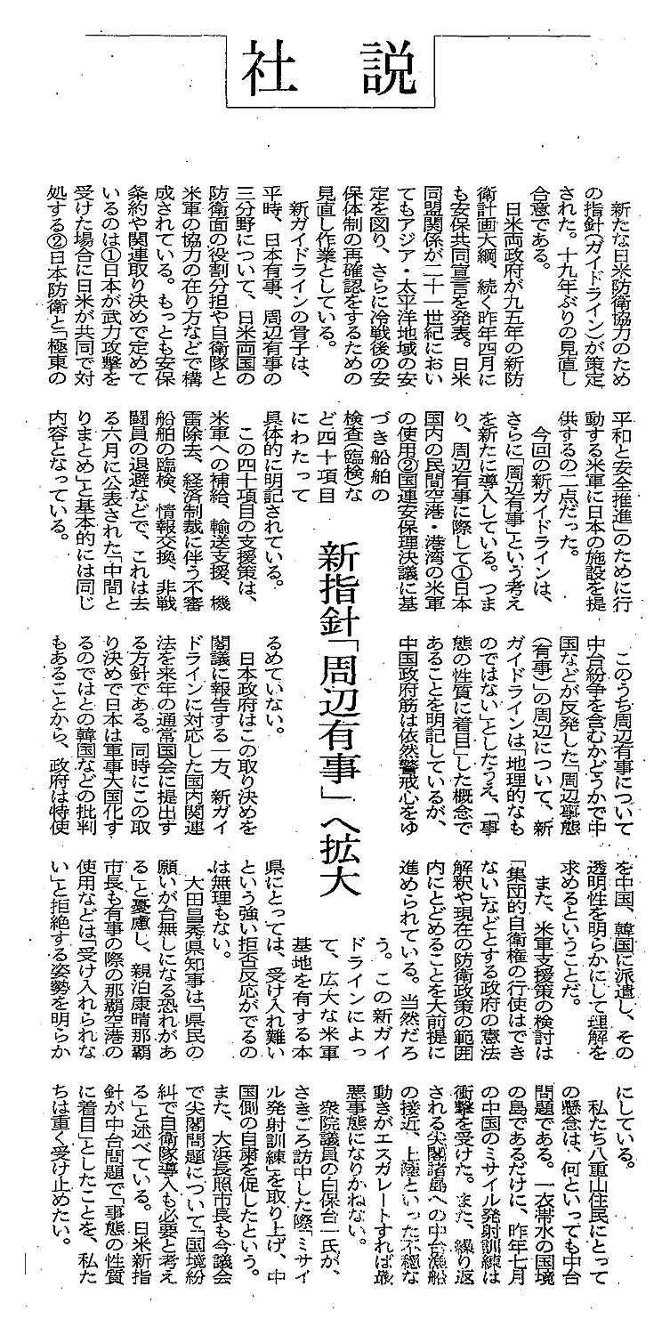 > <社説>新指針「周辺有事」へ拡大: