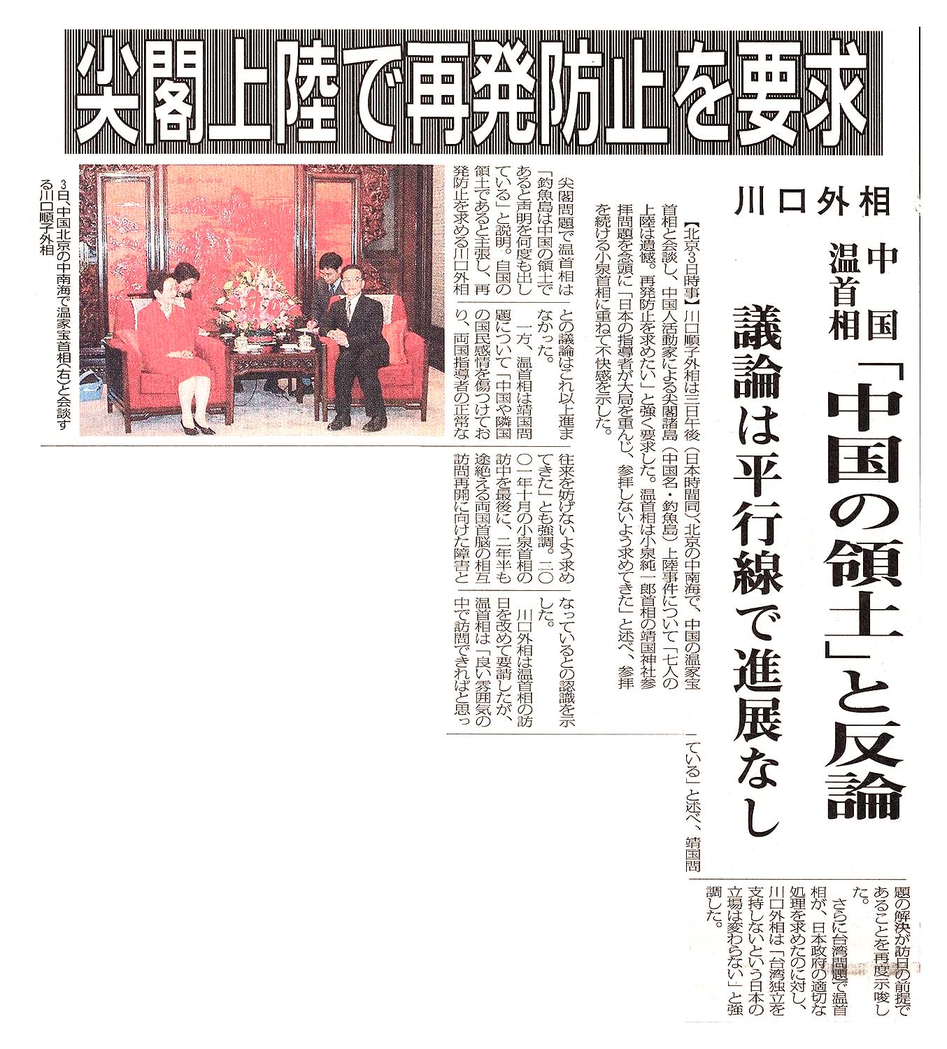 > 尖閣上陸で再発防止を要求/川口外相/中国温首相 「中国の領土」と反論/議論は平行線で進展なし: