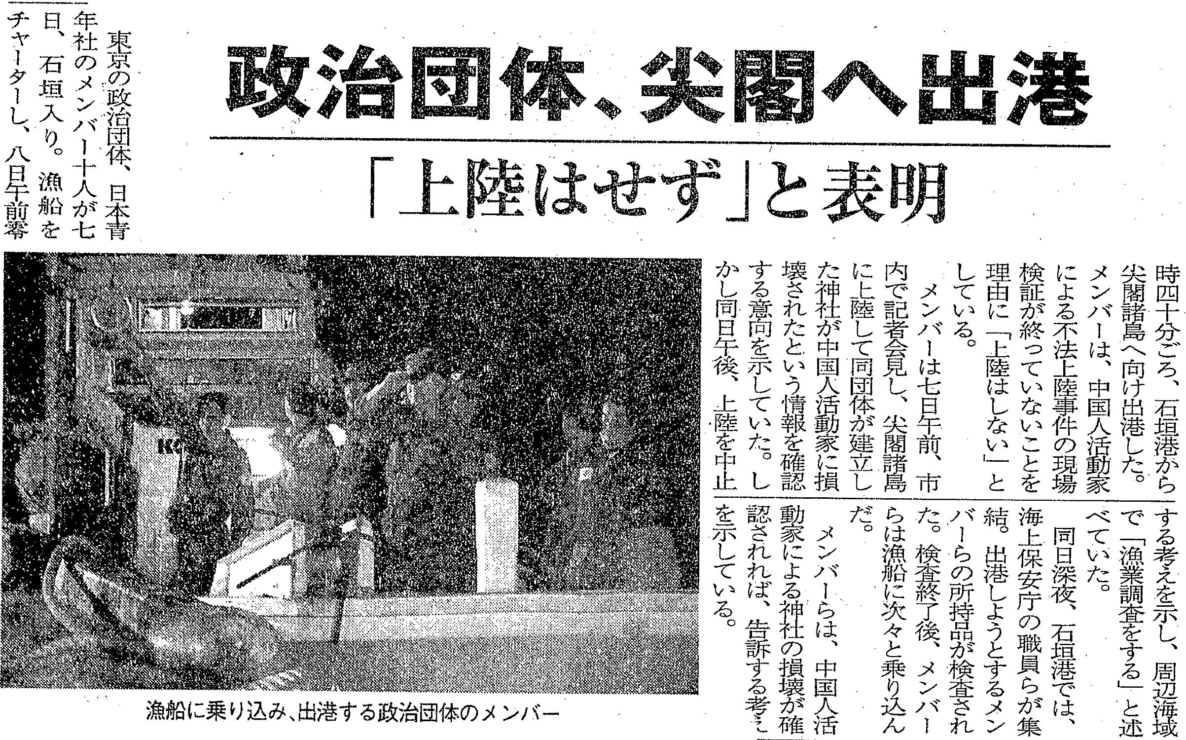 > 政治団体、尖閣へ出港/「上陸はせず」と表明: