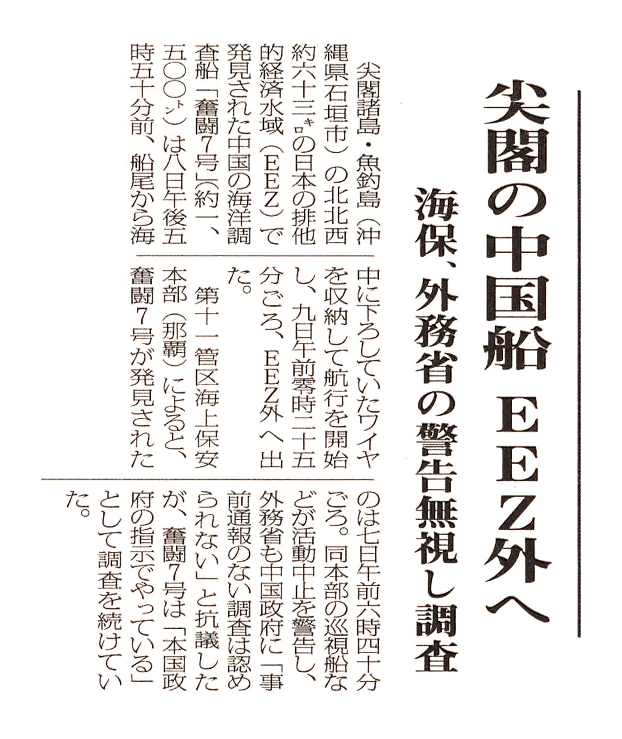 > 尖閣の中国船 EEZ外へ/海保、外務省の警告無視し調査: