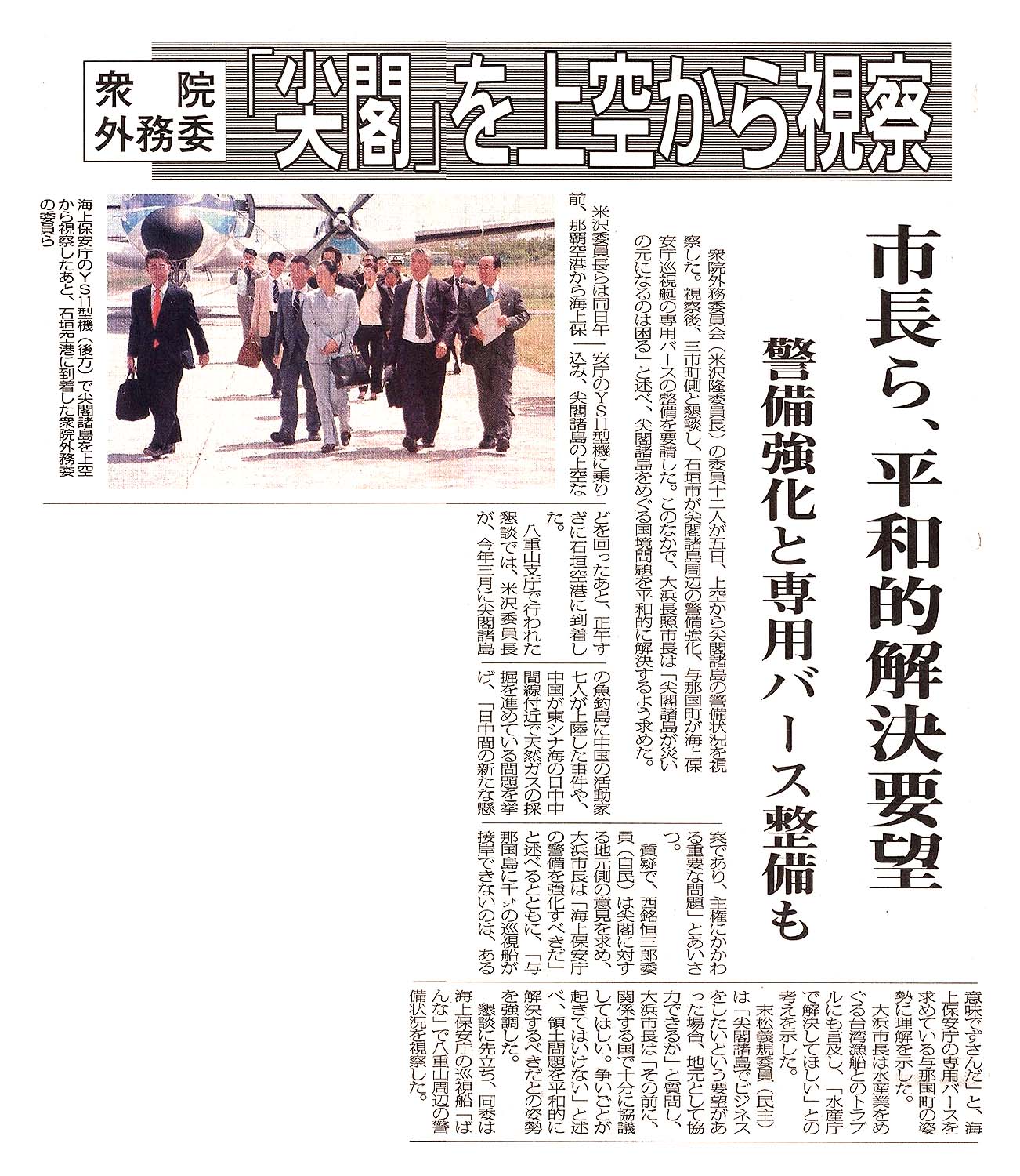 > 衆院外務委/「「尖閣」を上空から視察/市長ら、平和的解決を要望/警備強化と専用バース整備も: