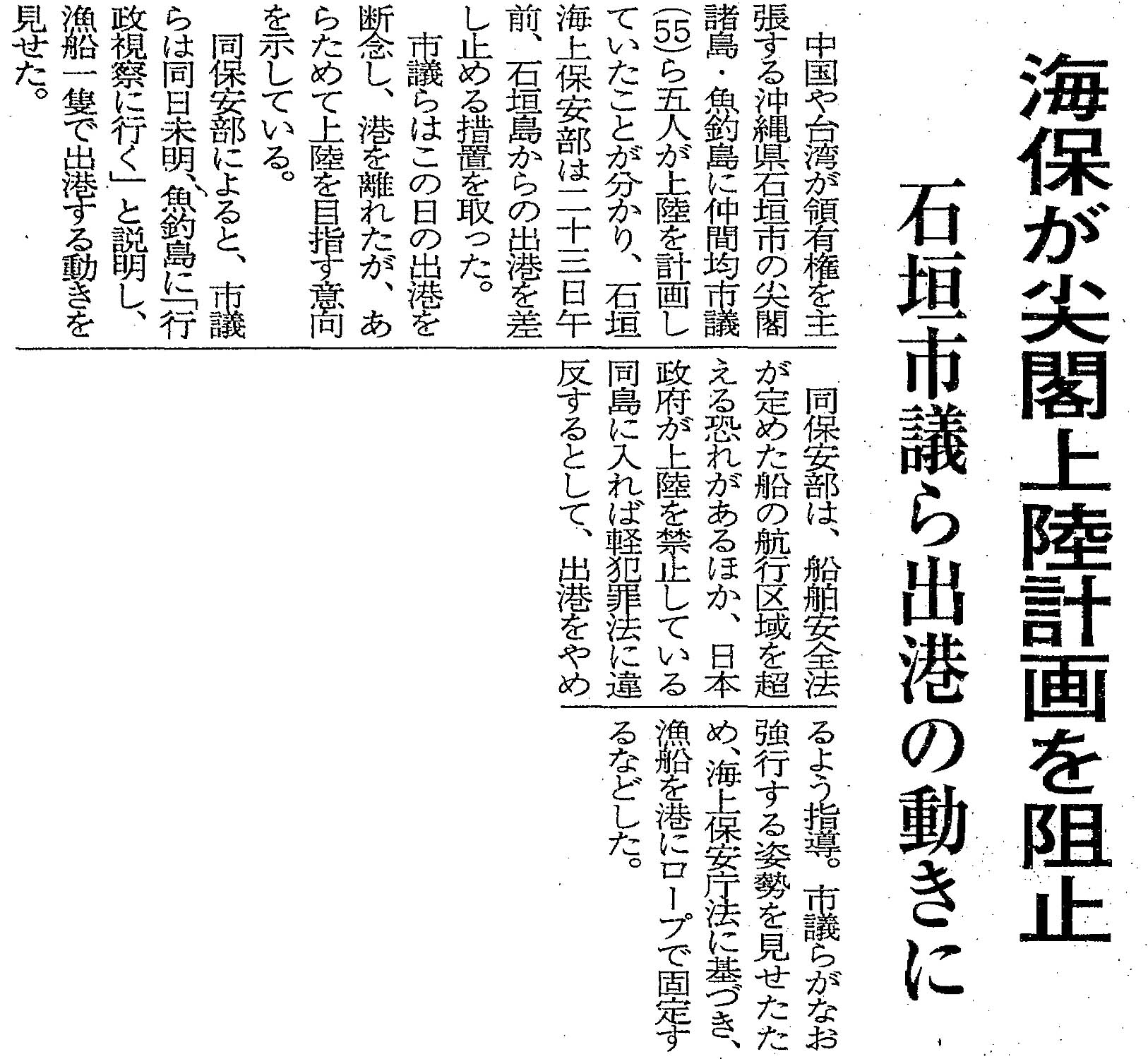 > 海保が尖閣上陸計画を阻止/石垣市議ら出港の動きに: