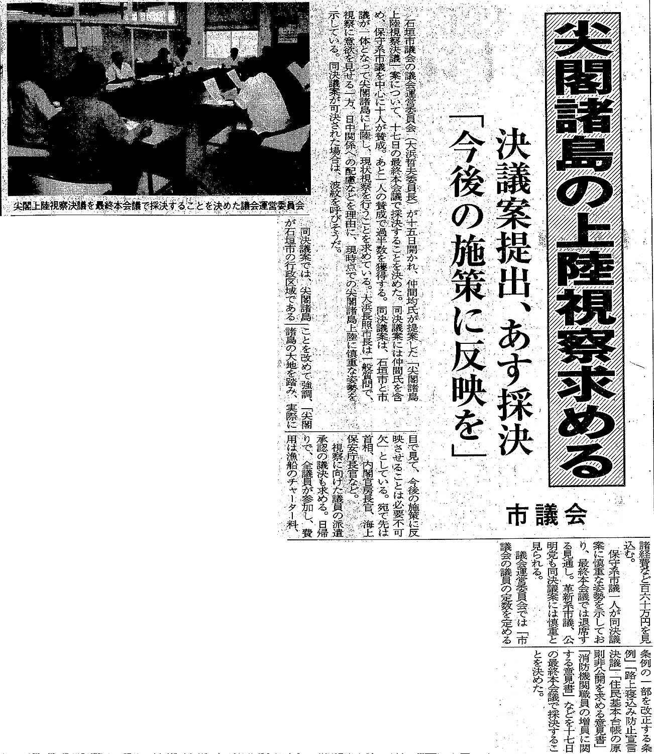 > 市議会/尖閣諸島の上陸視察を求める/決議案提出、あす採決「今後の施策に反映を」: