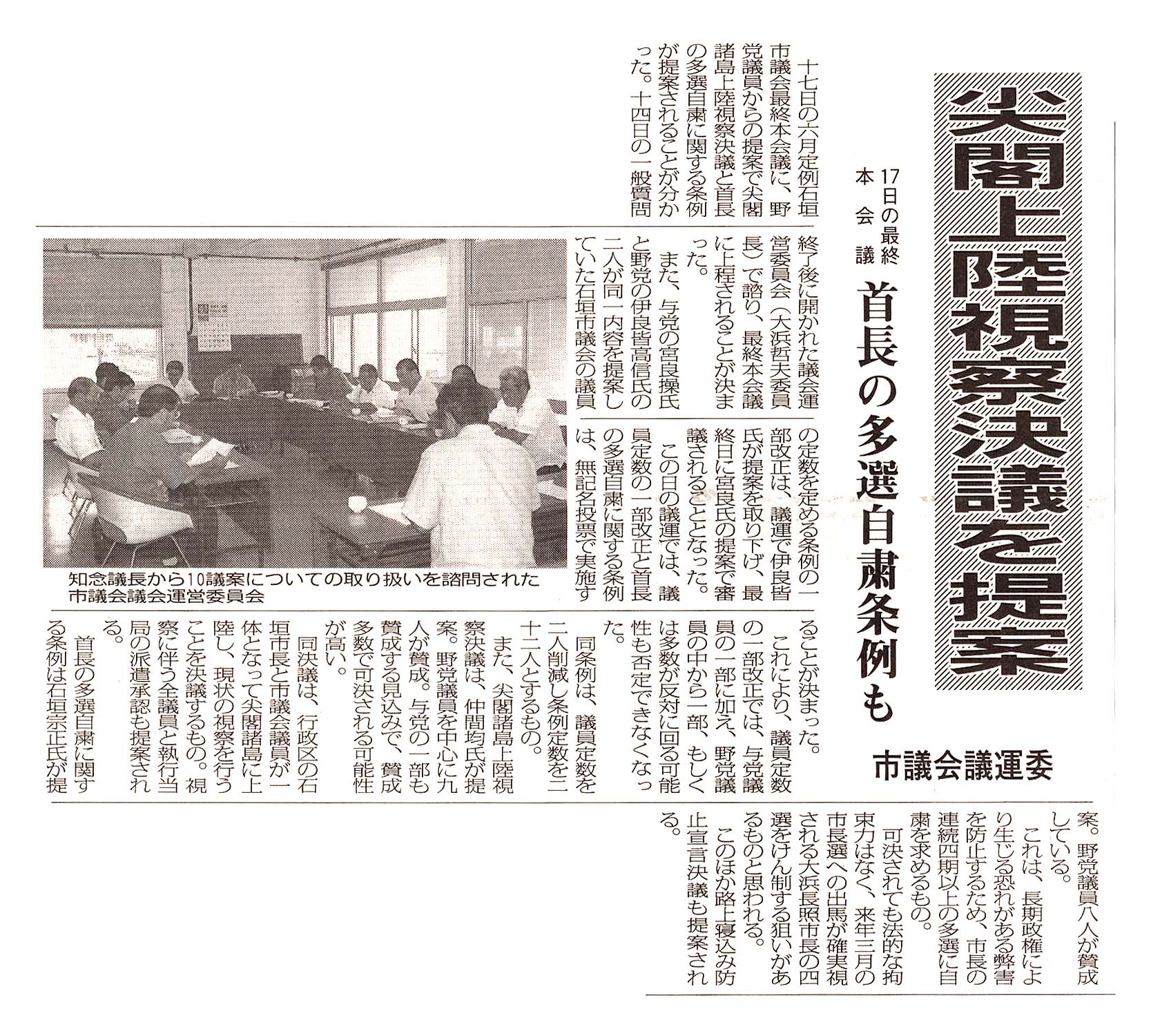 > 尖閣上陸視察決議を提案/17日の最終本会議/首長の多選自粛条例も/市議会議運委: