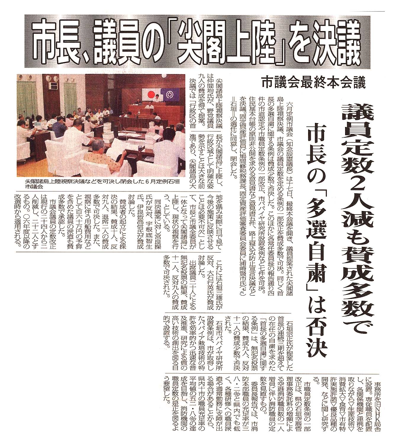 > 石垣市議会最終本会議で市長、議員の「尖閣上陸」案や議員定数2人減などを決議: