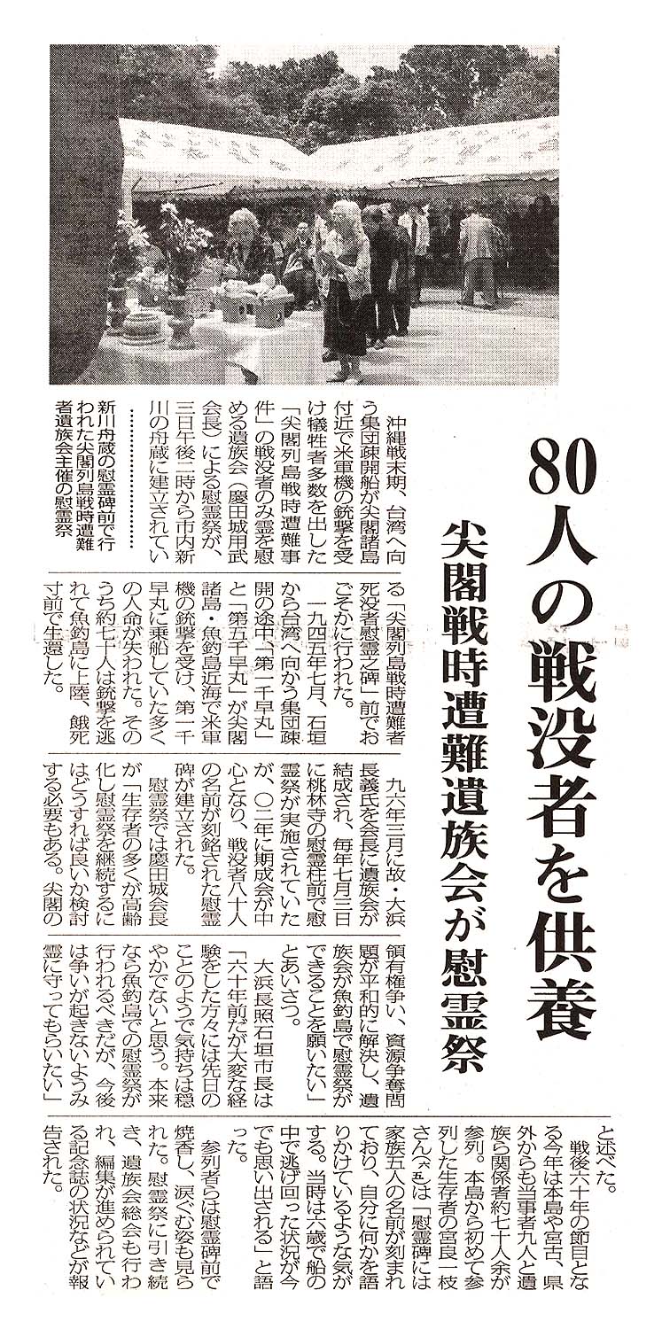 80人の戦没者を供養/尖閣戦時遭難遺族会が慰霊祭