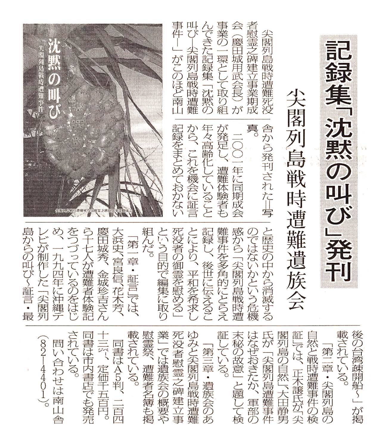 > 記録集「沈黙の叫び」を発刊/尖閣列島戦時遭難遺族会: