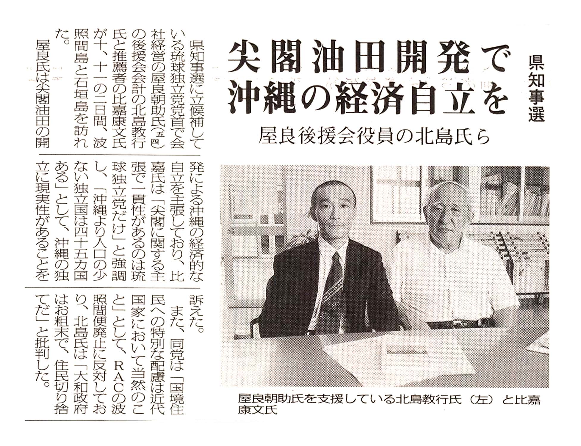 > 尖閣油田開発で沖縄の経済自立を/県知事選挙/屋良講演会役員の北島氏ら: