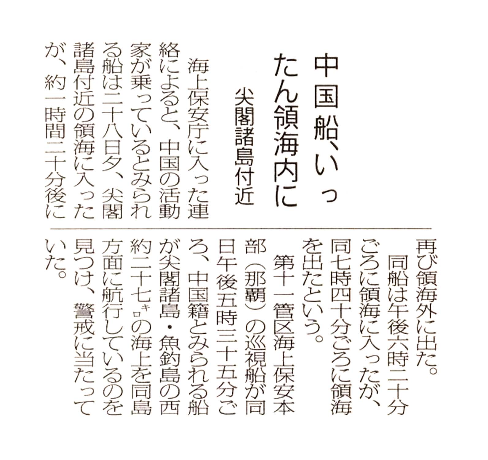> 中国船、いったん領海内に/尖閣諸島付近: