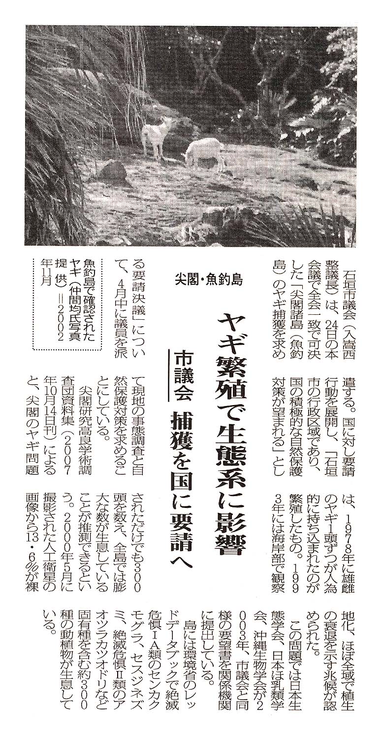 > 尖閣・魚釣島/ヤギ繁殖で生態系に影響/市議会 捕獲を国に要請へ: