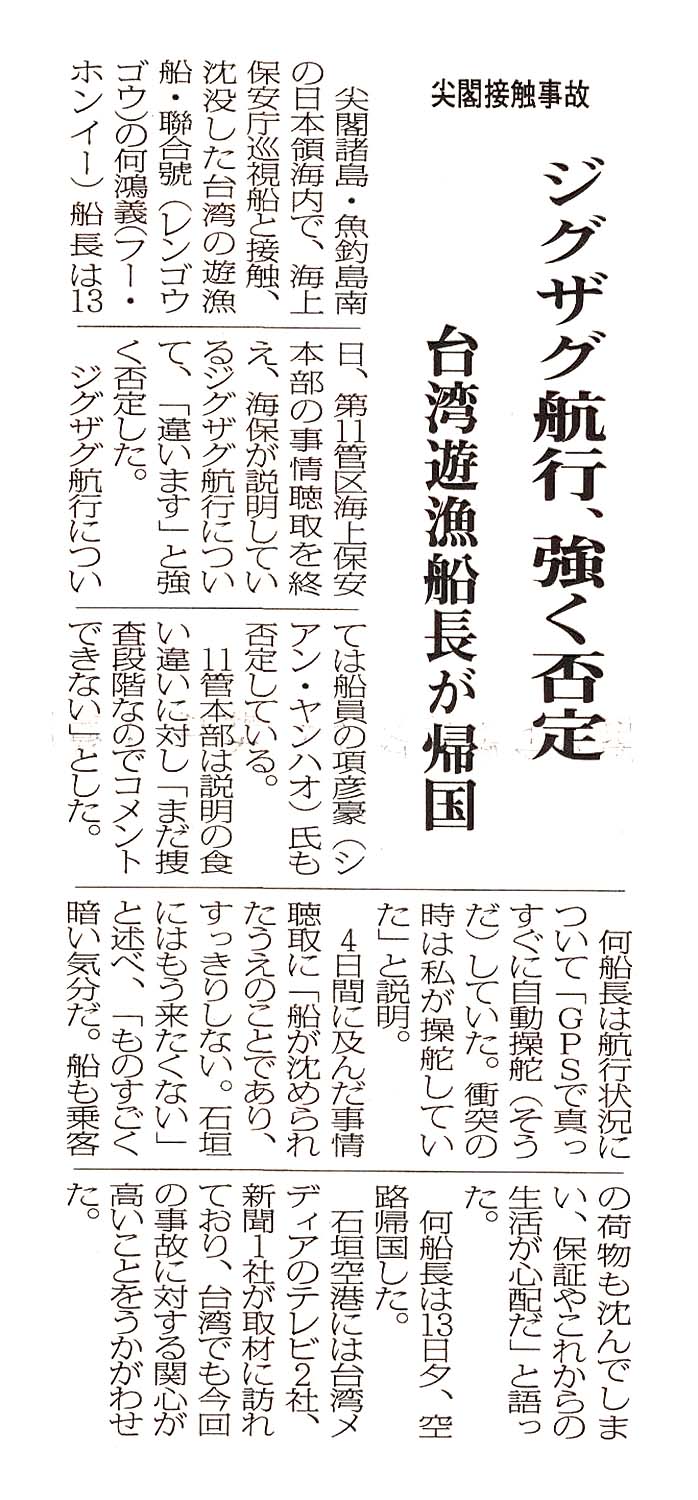 > 尖閣接触事故/ジグザグ航行、強く否定/台湾遊漁船長が帰国: