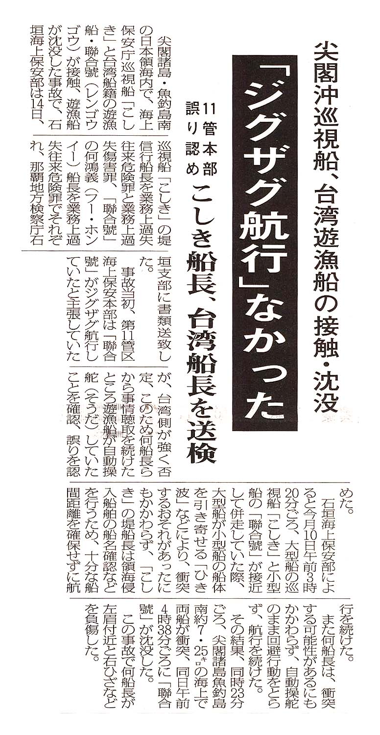 尖閣沖巡視船、台湾遊漁船の接触・沈没/「ジグザグ航行」なかった/11管本部誤り認め こしき船長、台湾船長を送検