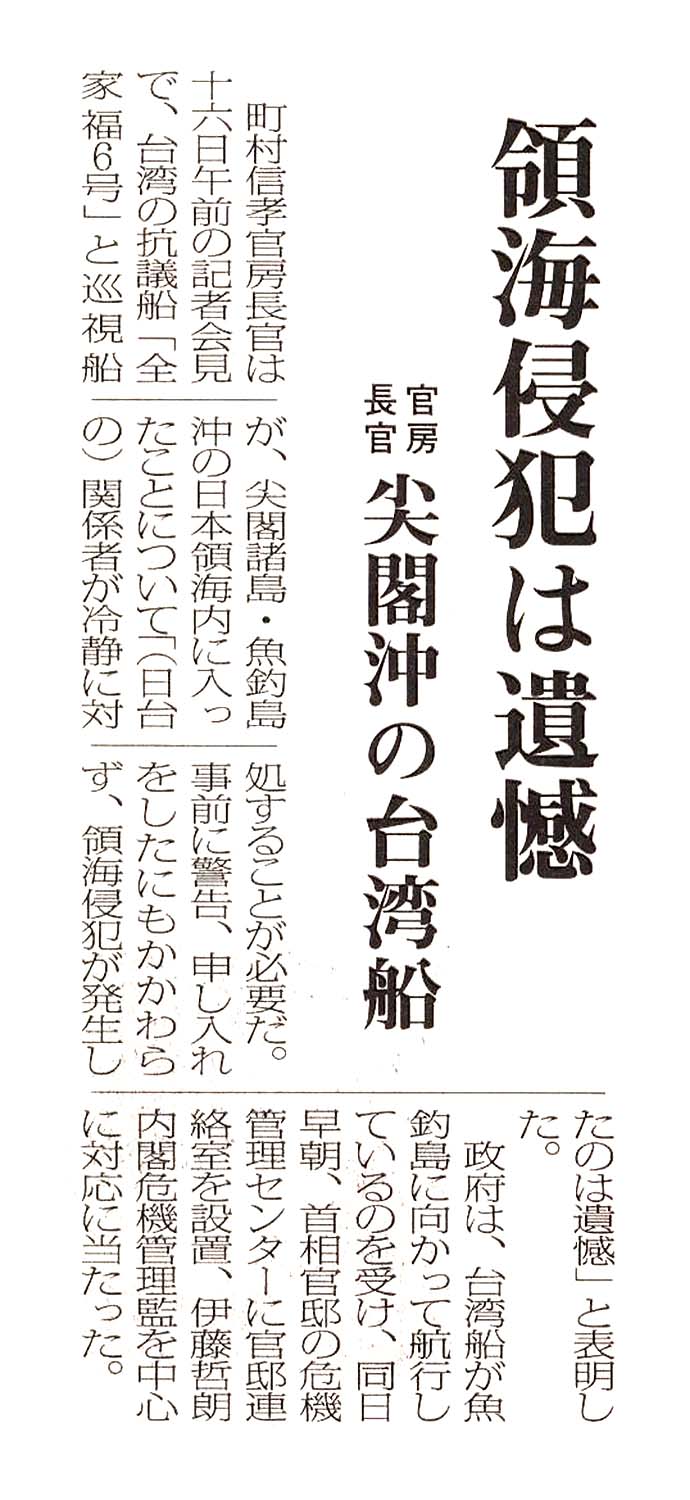 > 領海侵犯は遺憾/官房長官 尖閣沖の台湾船: