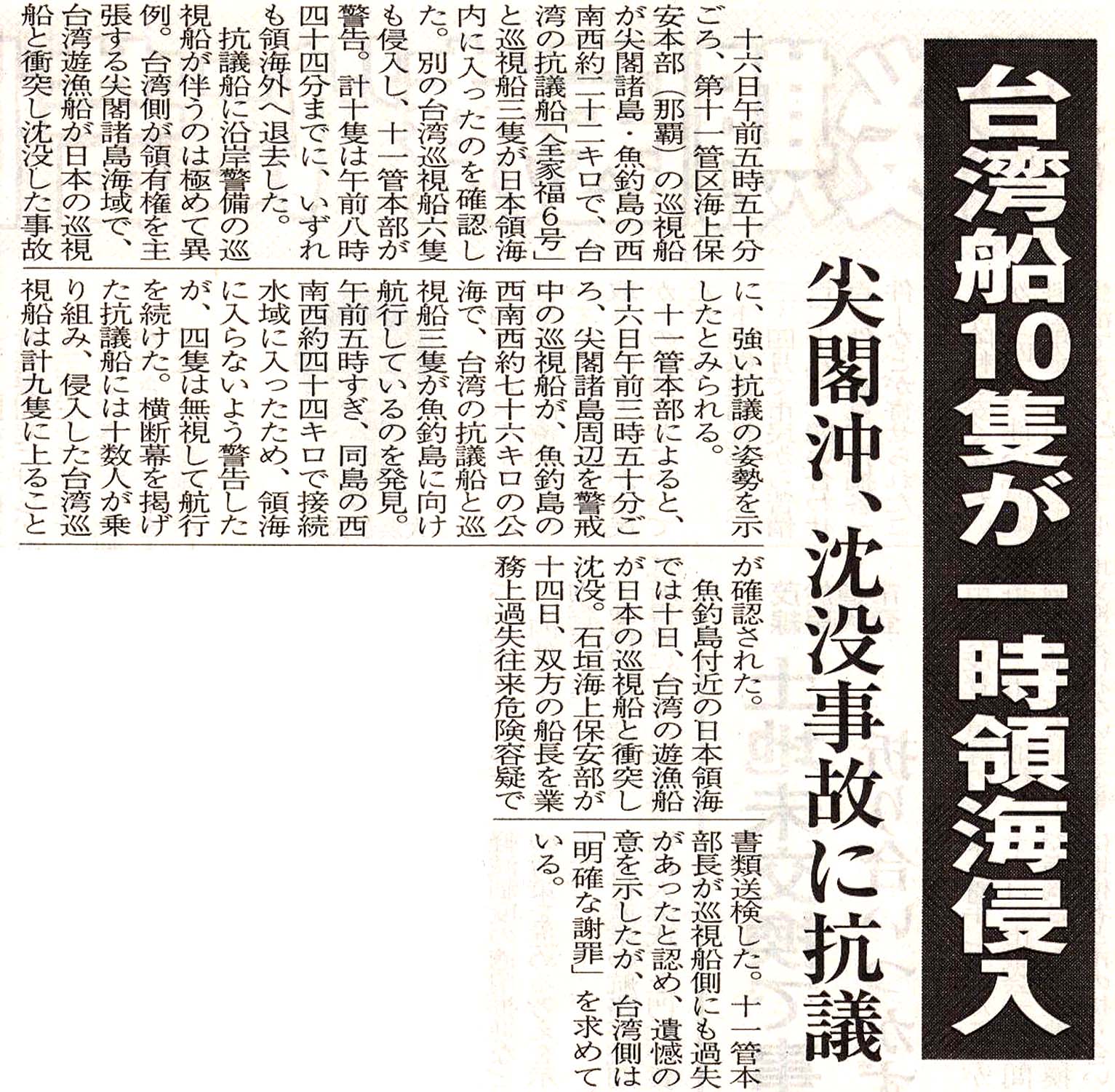 > 台湾船10隻が一時領海侵入/尖閣沖、沈没事故に抗議: