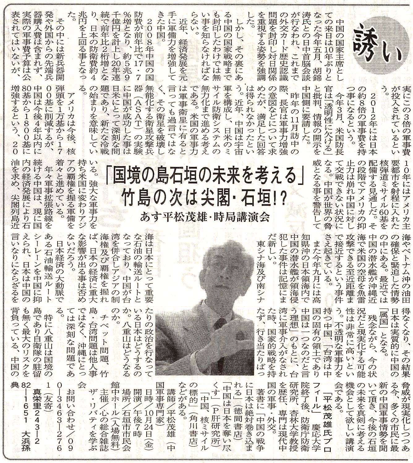 > <誘い>「国境の島石垣の未来を考える」竹島の次は尖閣・石垣?/あす平松茂雄・時局講演会: