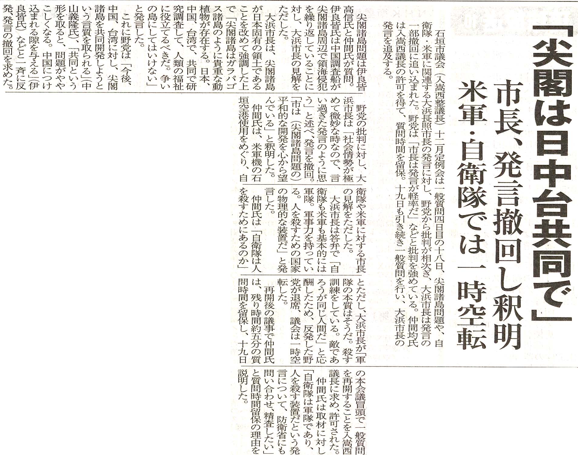 「尖閣は日中台共同で」/市長、発言撤回し釈明/米軍・自衛隊では一時空転