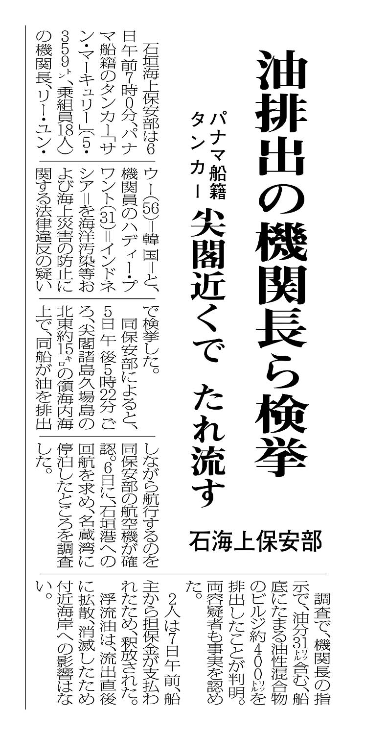 > 油排出の機関長ら検挙/パナマ船籍タンカー 尖閣近くでたれ流す/石海上保安部: