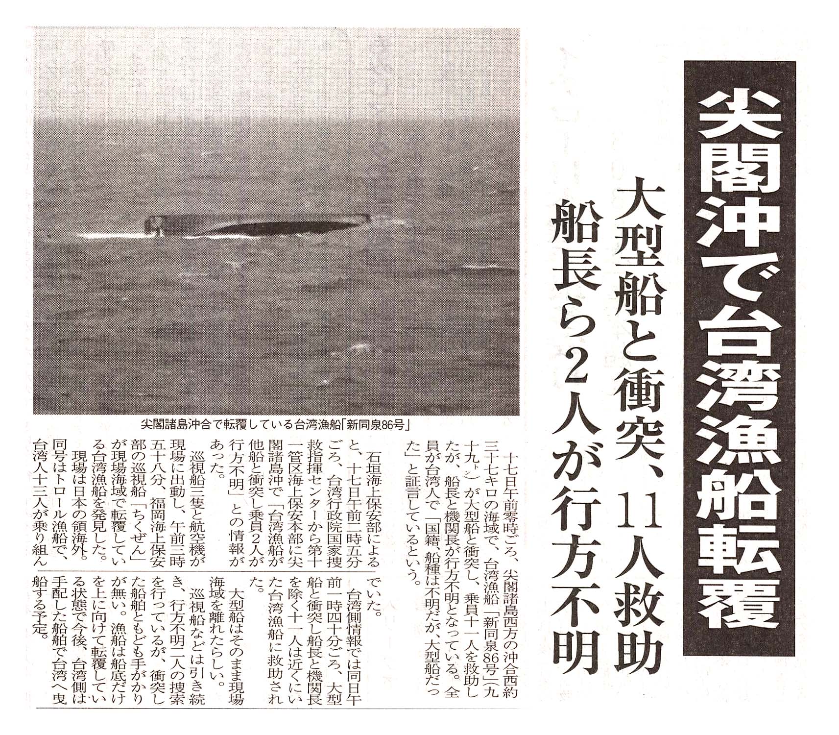 > 尖閣沖で台湾漁船転覆/大型船と衝突転覆、11人救助/船長ら2人が行方不明: