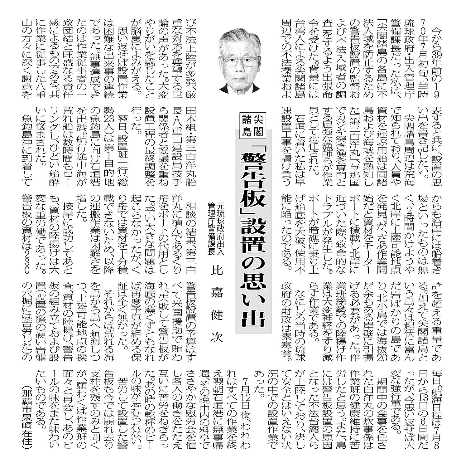 > 尖閣諸島/「警告板」設置の思い出/元琉球政府出入管理庁警備課長 比嘉健次: