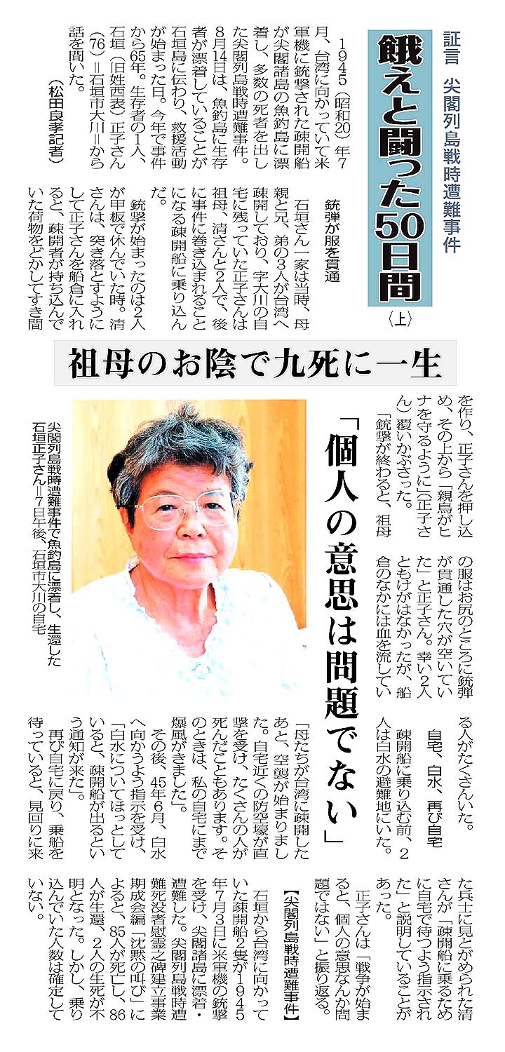証言 尖閣列島戦時遭難事件/鍛えと闘った50日間(上)/祖母のお陰で九死に一生/「個人の意思は問題でない」