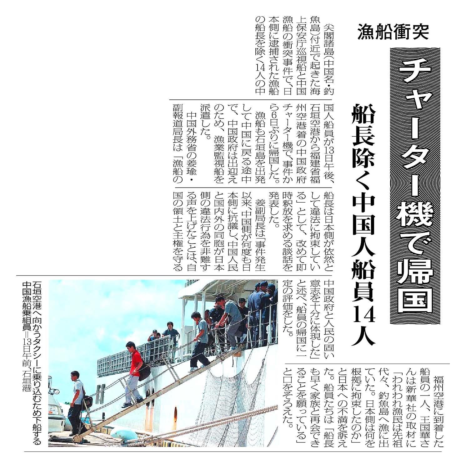 > 漁船衝突/チャーター機で帰国/船長除く中国人船員14人 :