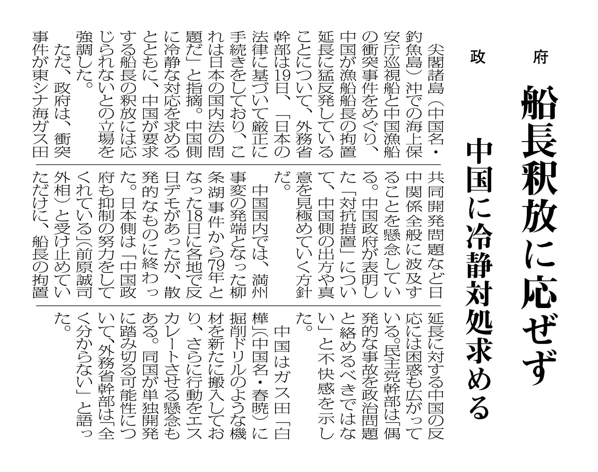 > 政府/船長釈放に応ぜず/中国に冷静対処求める: