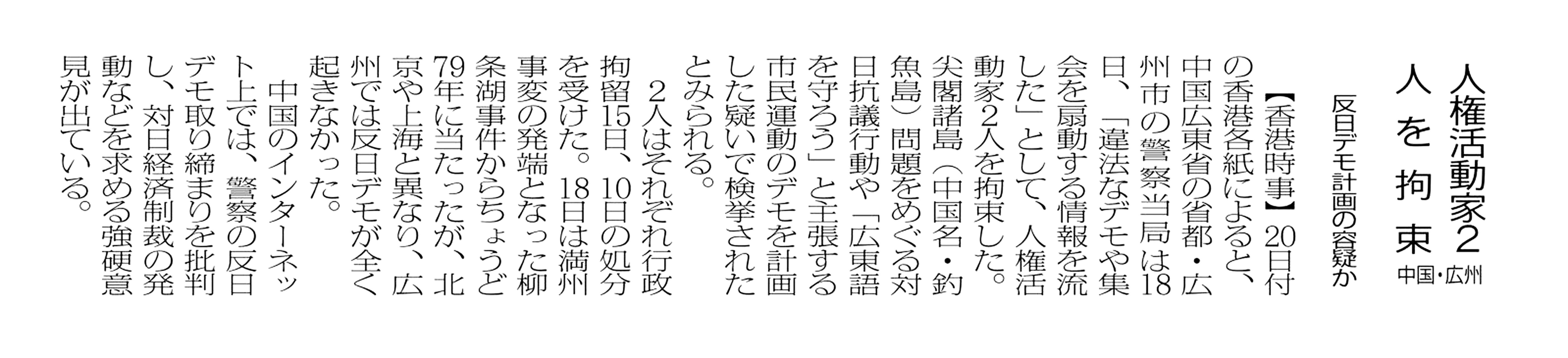 > 人権活動家2人を拘束/中国・広州: