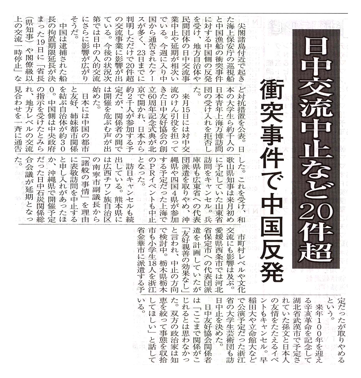 > 日中交流中止など20件超/衝突事件で中国反発: