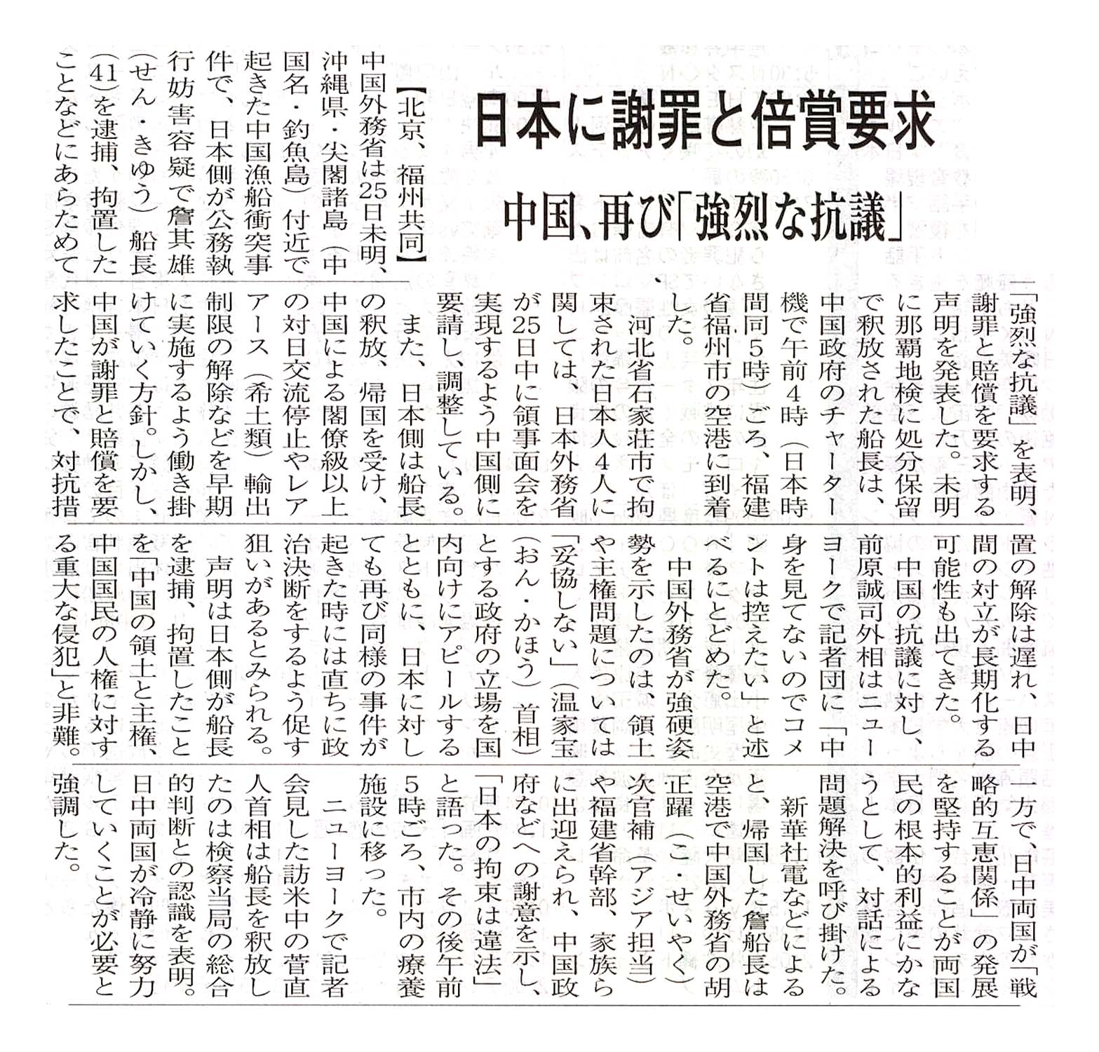 > 日本に謝罪と倍賞要求/中国、再び「強烈な抗議」: