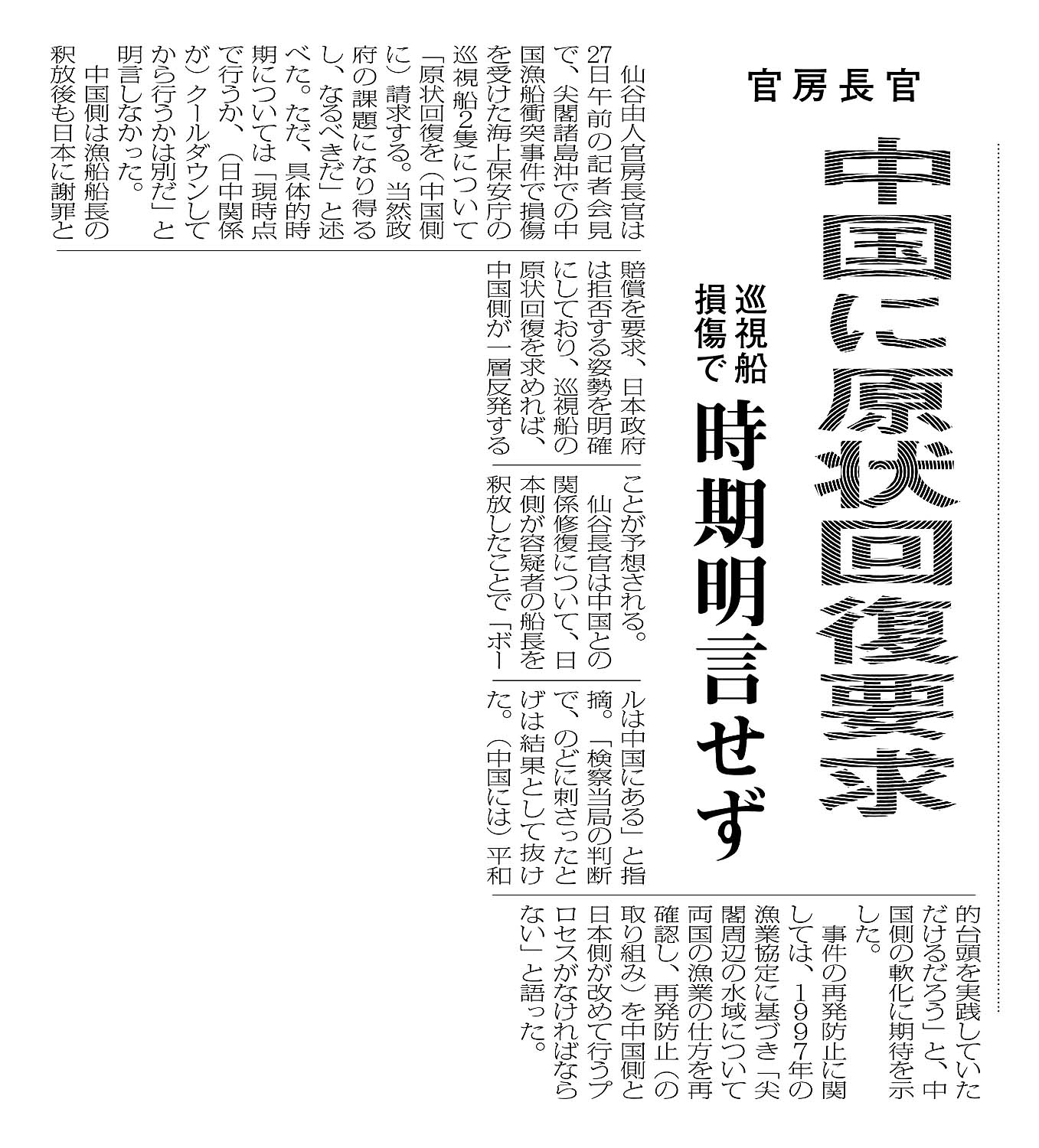 > 官房長官/中国に原状回復要求/巡視船損傷で 時期明言せず: