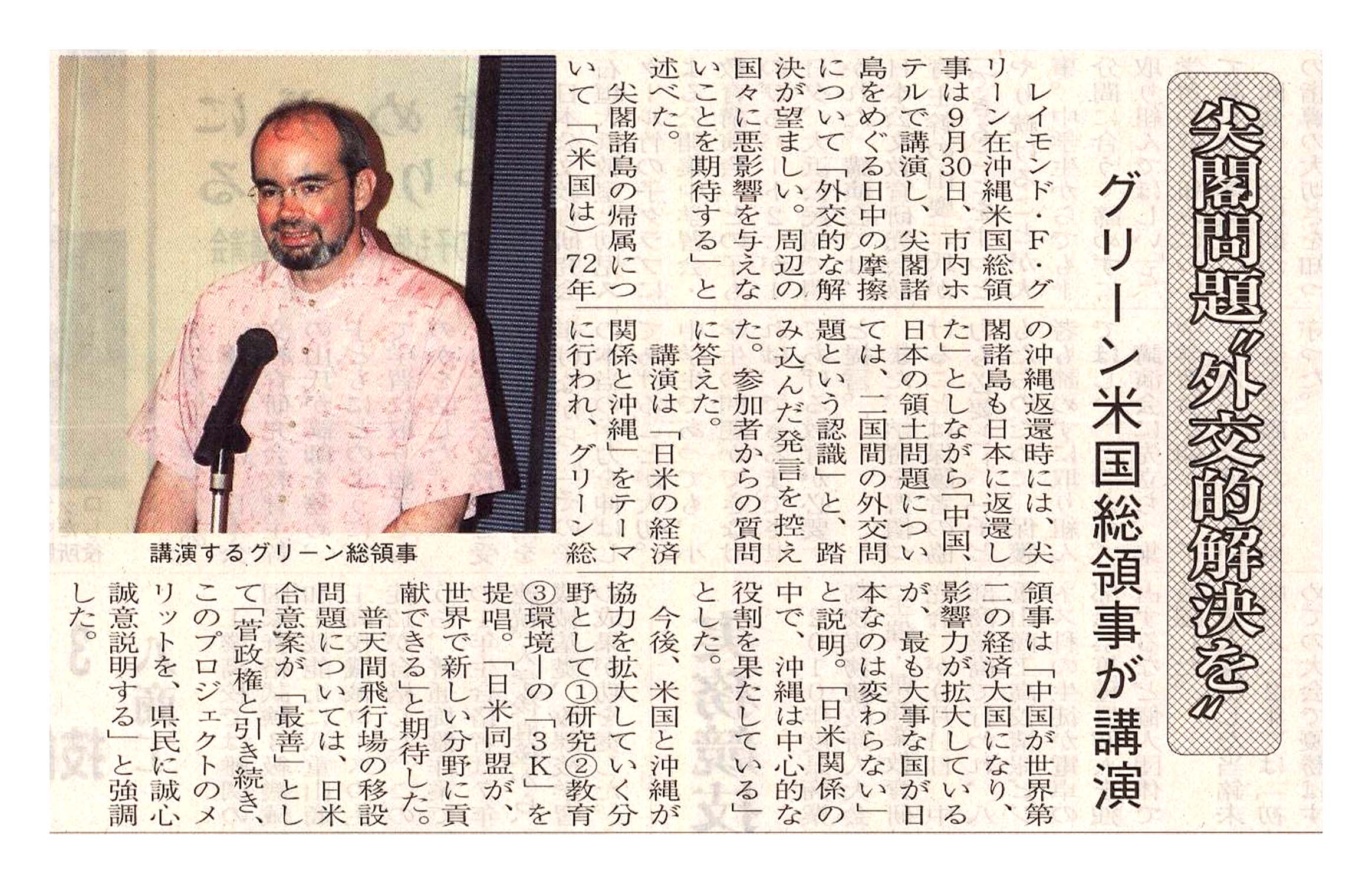 > 尖閣問題”外交的解決を”/グリーン米国総領事が講演: