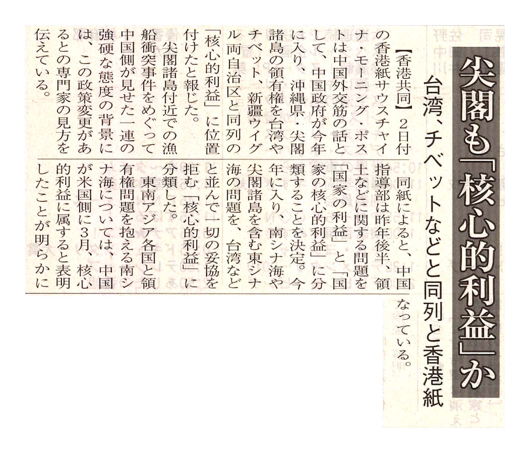 > 尖閣も「核心的利益」か/台湾、チベットなどと同列と香港紙: