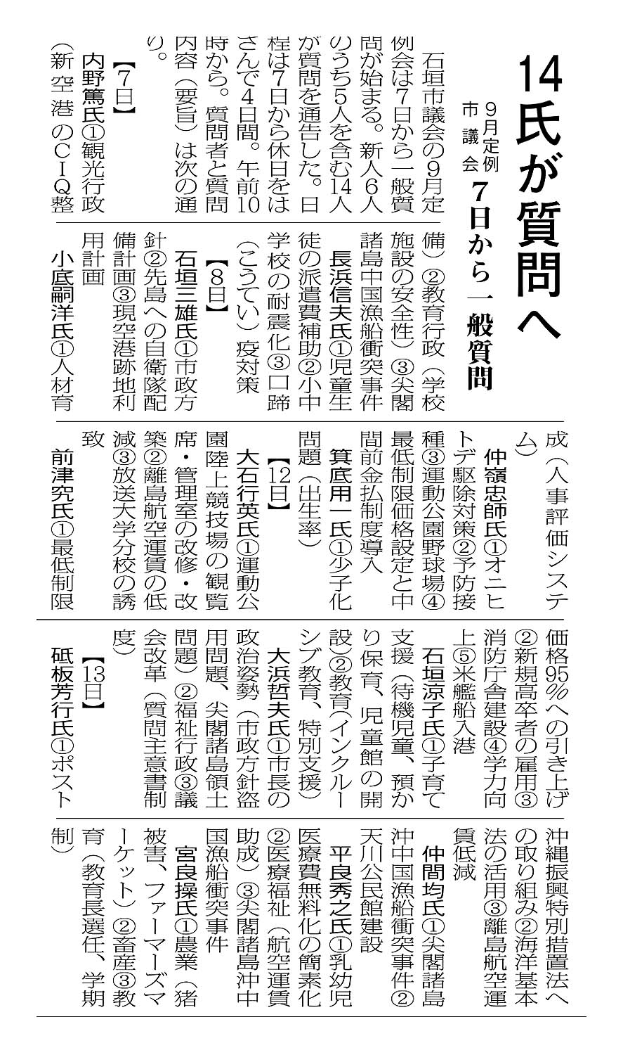 > 14氏が質問へ/9月定例市議会/7日から一般質問: