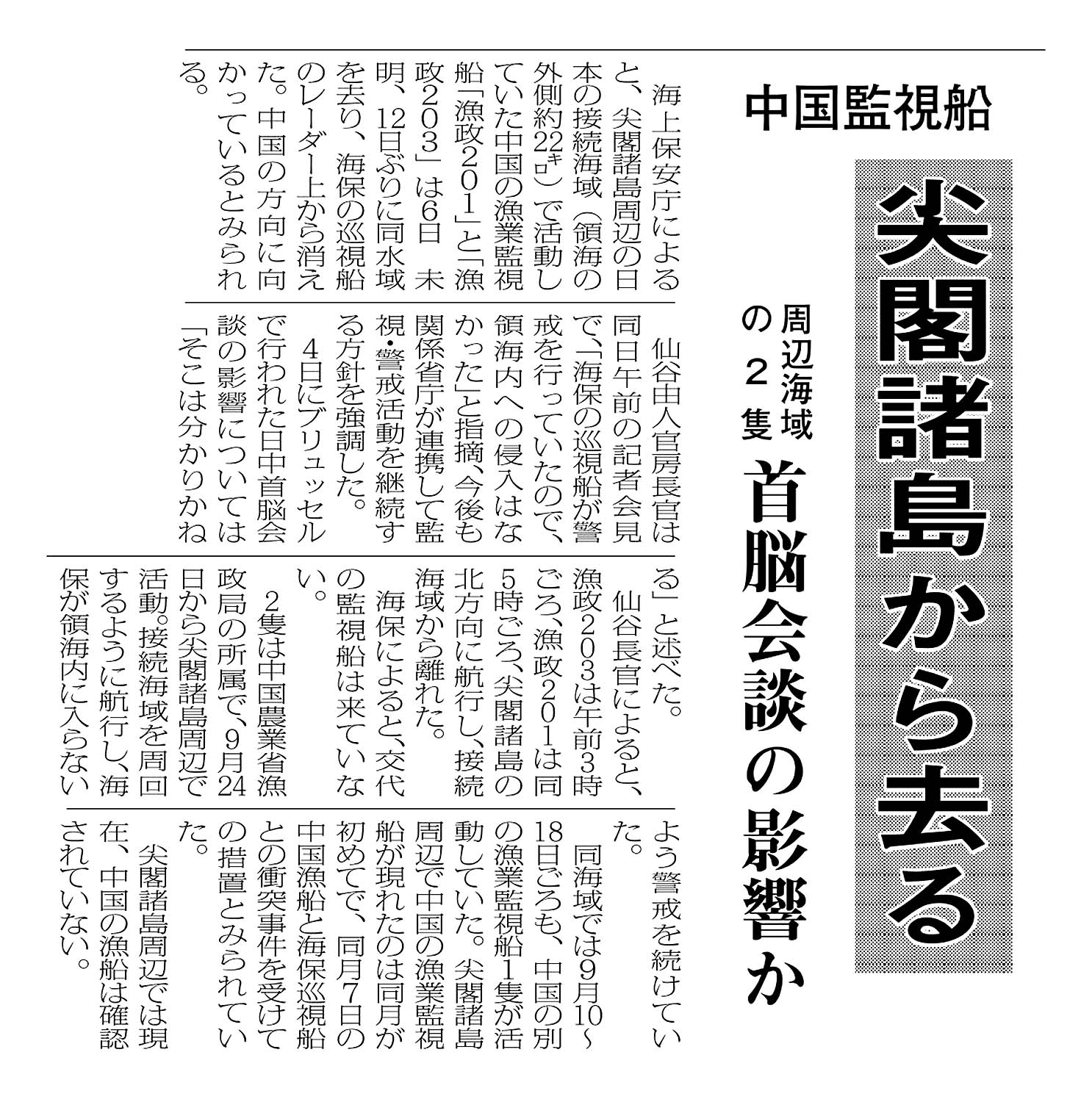 > 中国監視船/尖閣諸島から去る/周辺海域の2隻 首脳会談の影響か: