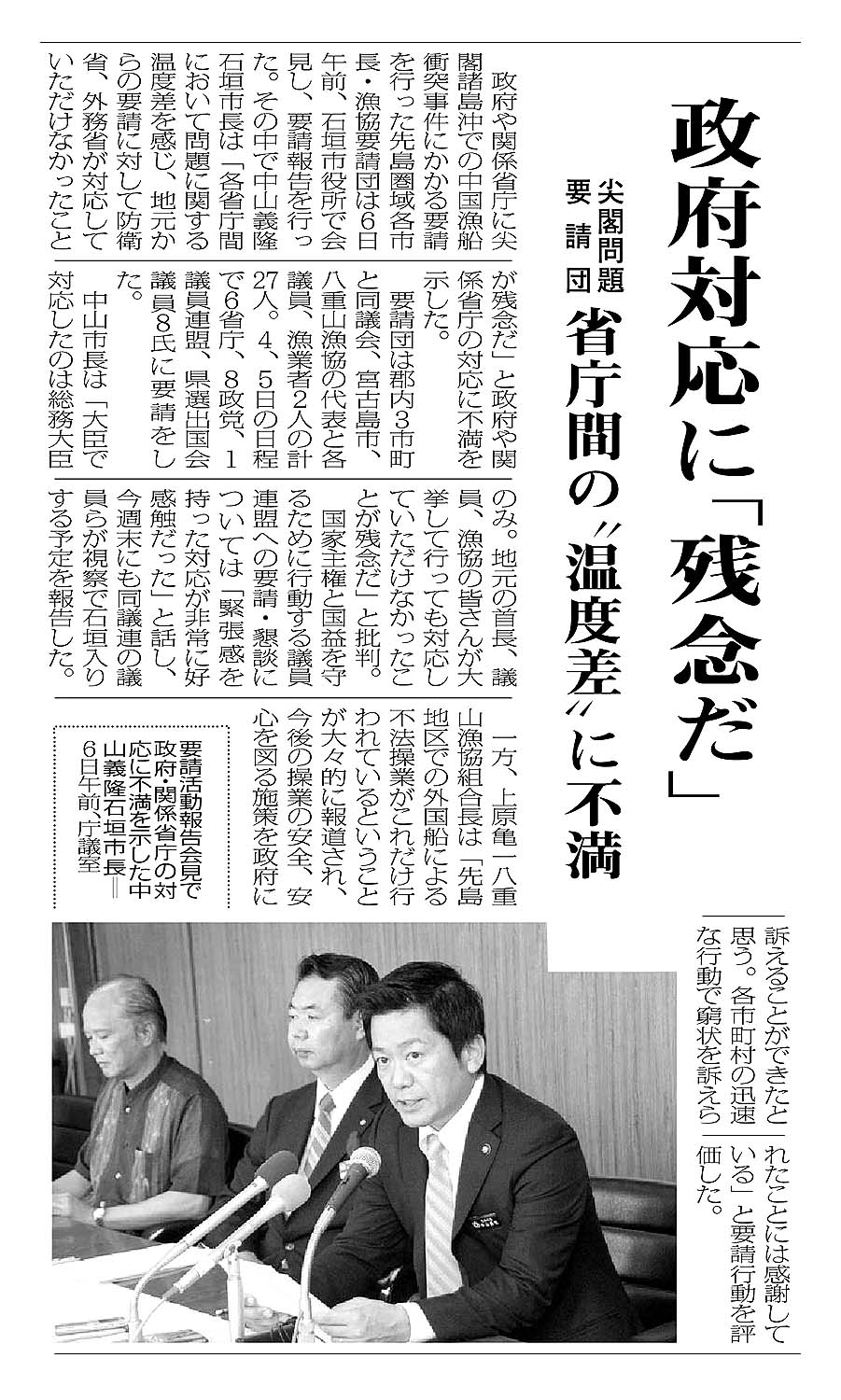 > 政府対応に「残念だ」/尖閣問題要請団/省庁間の”温度差”に不満: