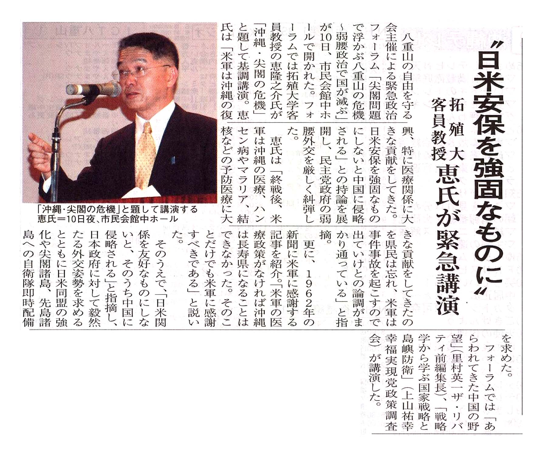 > ”日米安保を強固なものに”/拓殖大客員教授 恵氏が緊急講演: