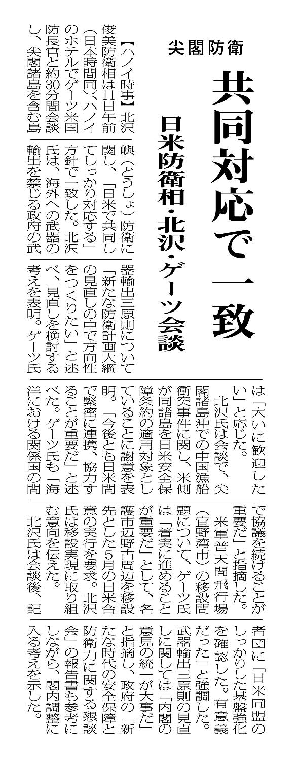 > 尖閣防衛/共同対応で一致/日米防衛相・北沢・ゲーツ会談:
