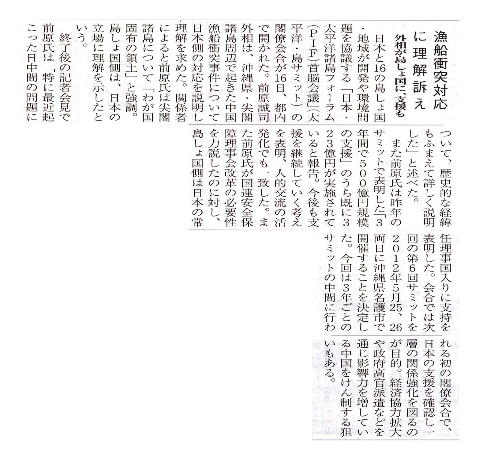 漁船衝突対応に理解訴え/外相が島しょ国に、支援も