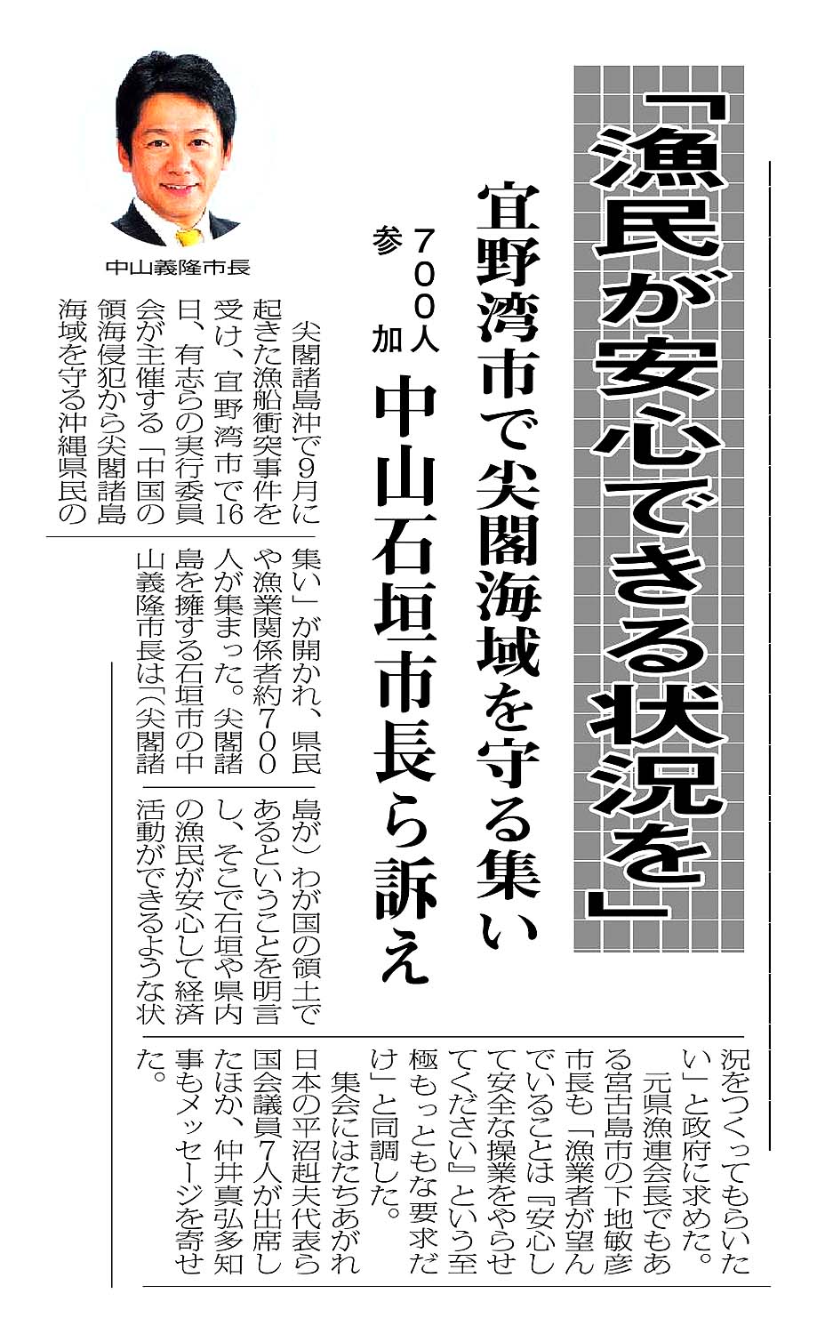 > 「漁民が安心できる状況を」/宜野湾市で尖閣海域を守る集い/700人参加 中山石垣市長ら訴え: