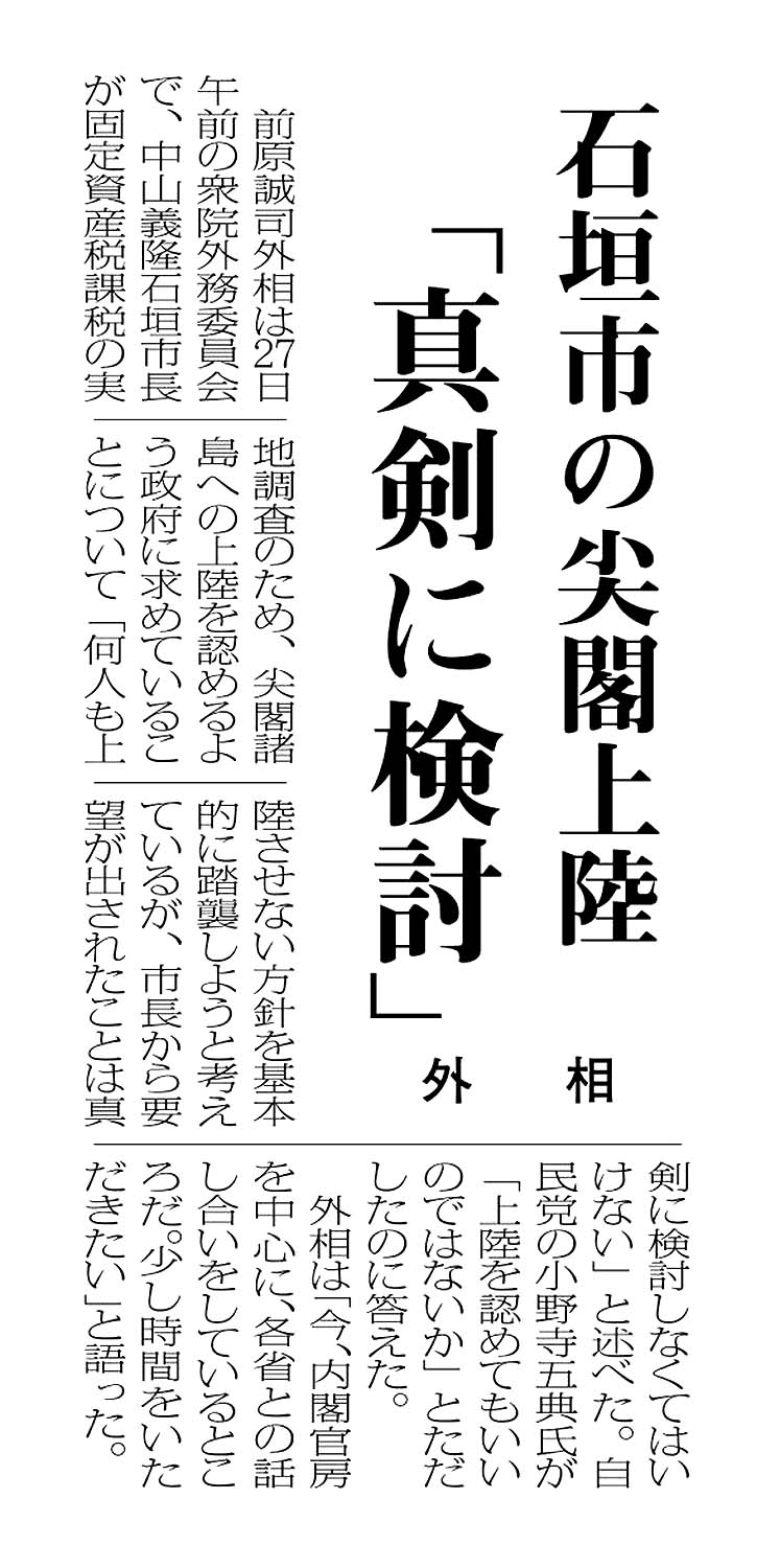 > 石垣市の尖閣上陸 「真剣に検討」/外相: