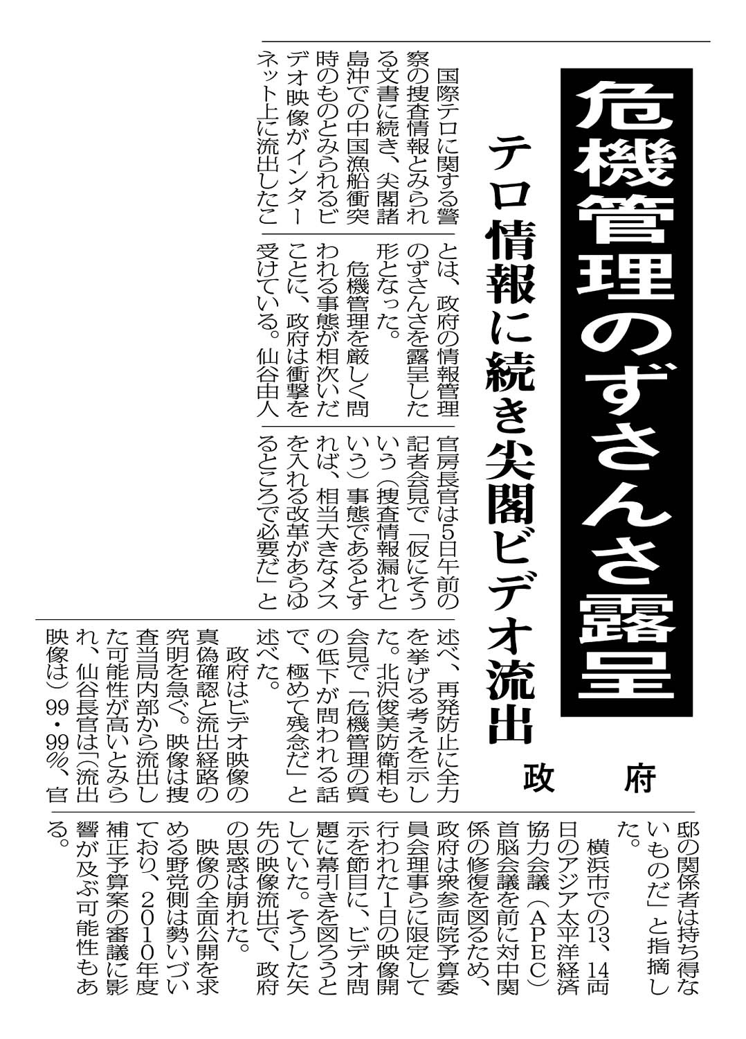 危機管理のずさんさ露呈/テロ情報に続き尖閣ビデオ流出/政府