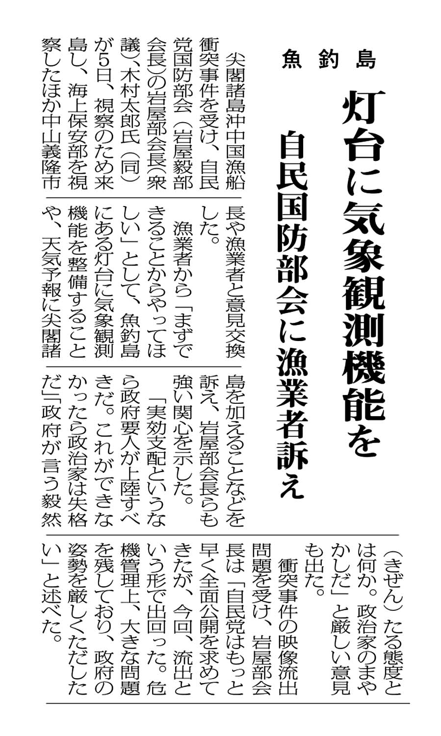 > 魚釣島/灯台に気象観測機能を/自民国防部会に漁業者訴え: