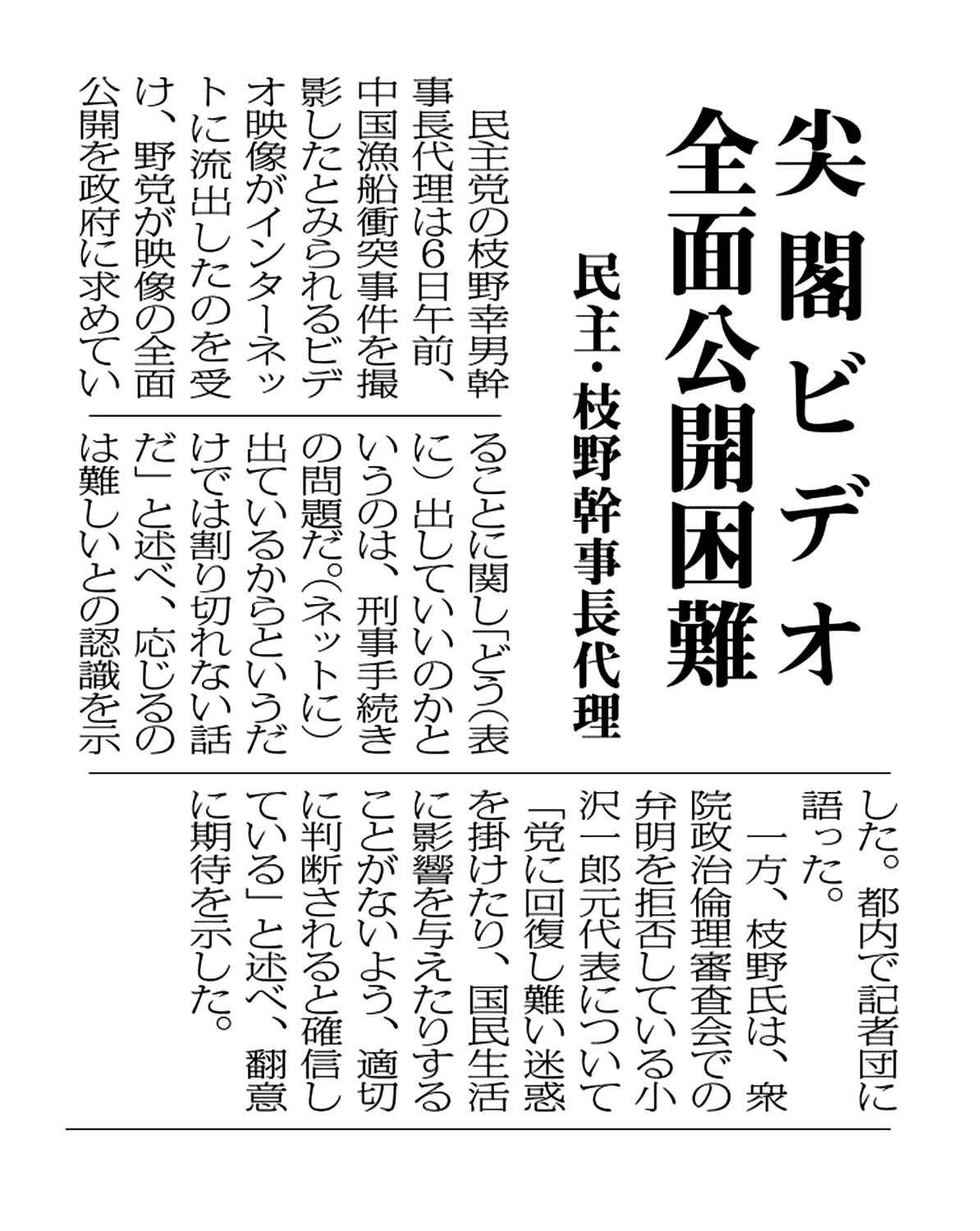 > 尖閣ビデオ全面公開困難/民主・枝野幹事長代理: