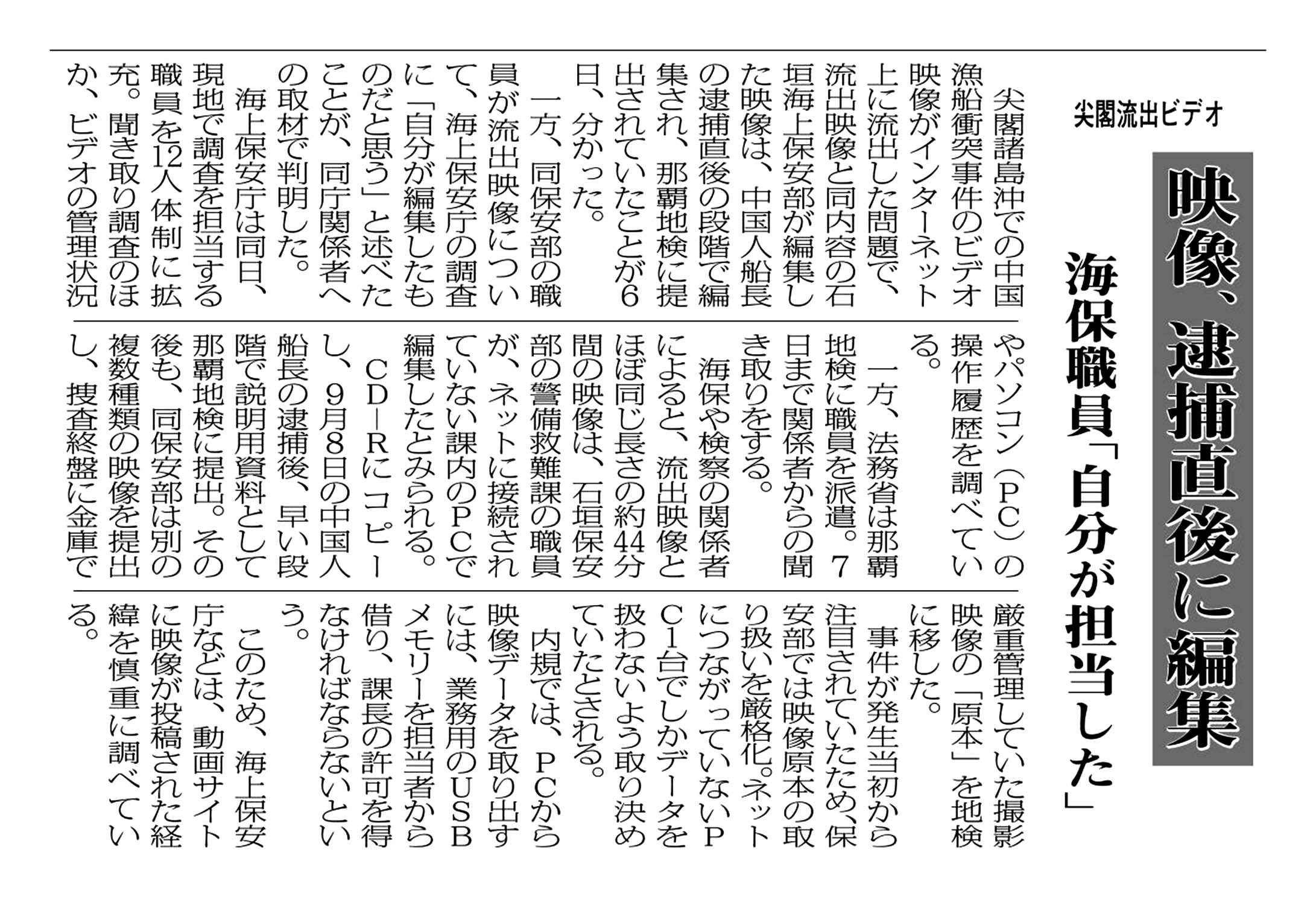 > 尖閣流出ビデオ/映像、逮捕直後に編集/海保職員「自分が担当した」:
