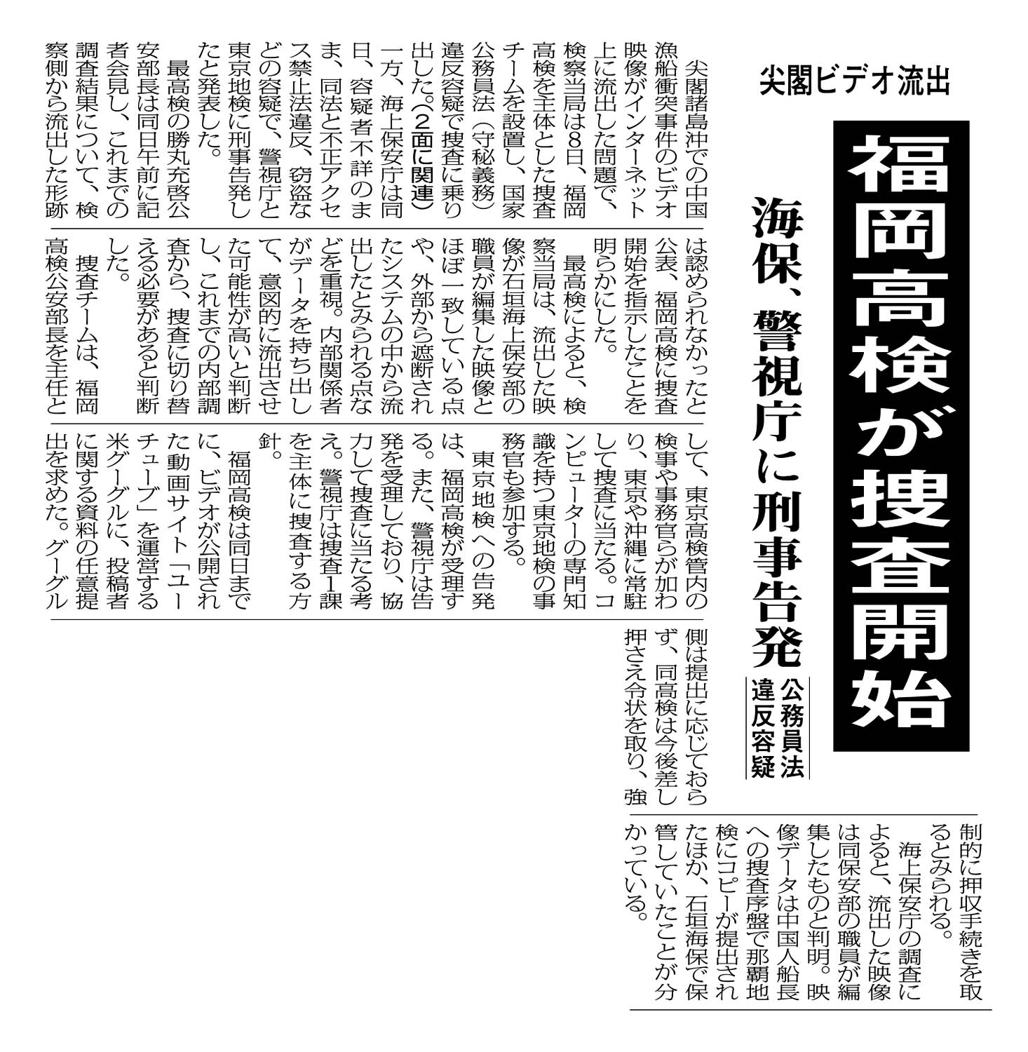 > 尖閣ビデオ流出/福岡高検が捜査開始/海保、警視庁に刑事告発/公務員法違反容疑: