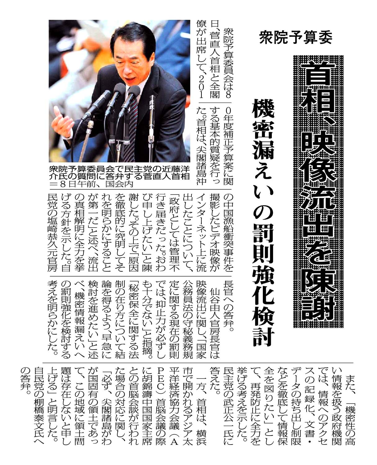 > 衆院予算委/首相、映像流出を陳謝/機密漏えいの罰則強化検討: