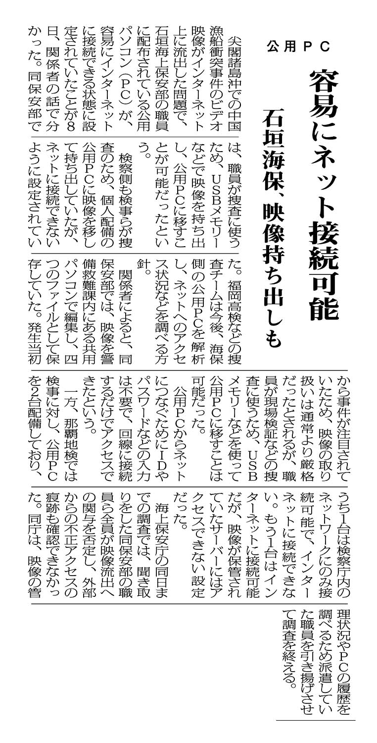 > 公用PC/容易にネット接続可能/石垣海保、映像持ち出しも: