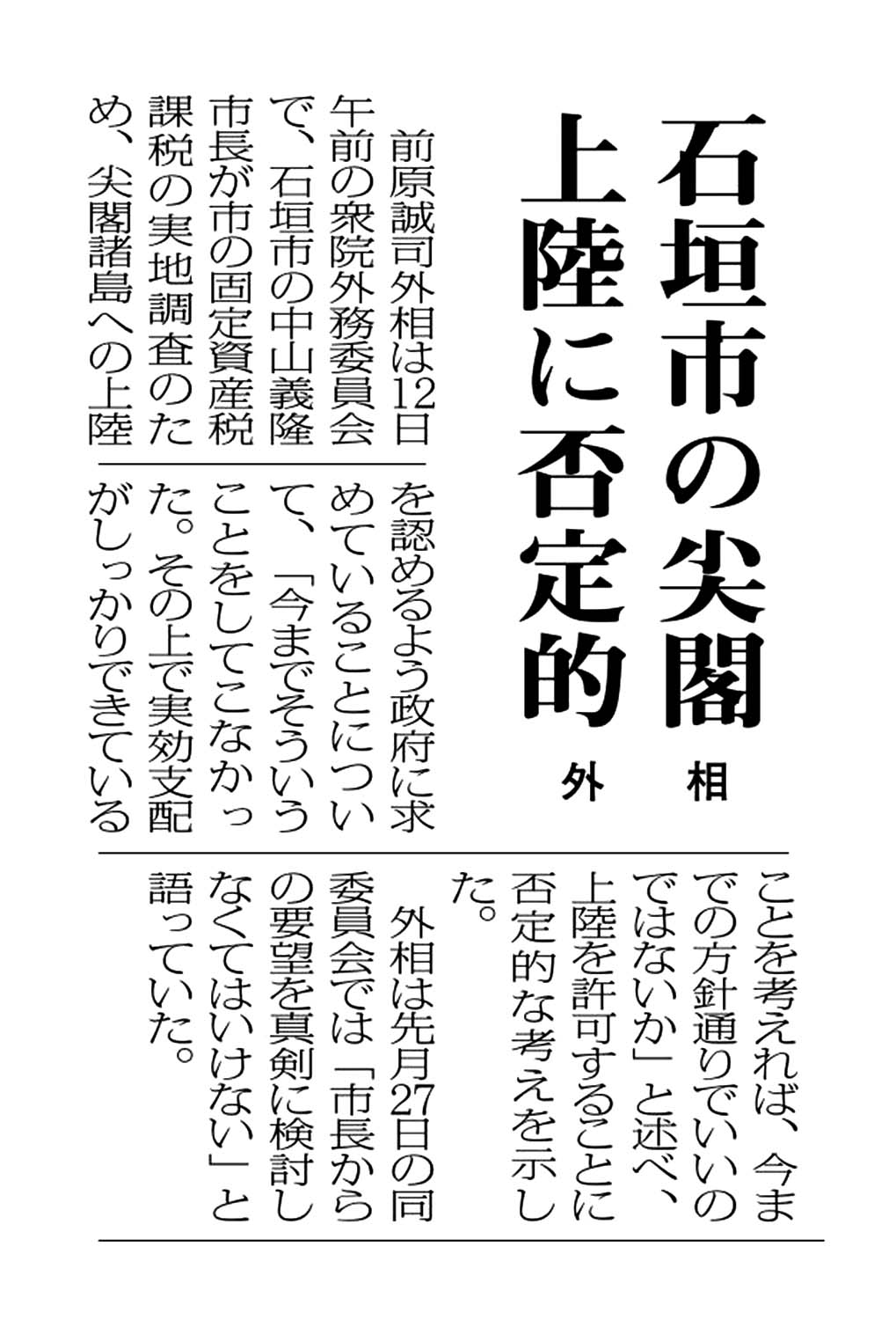 > 石垣市の尖閣上陸に否定的/外相: