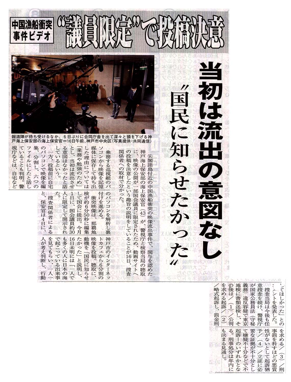 > 中国漁船衝突事件ビデオ/”議員限定”で投稿決意/当初は流出の意図なし/”国民にしらせたかった”: